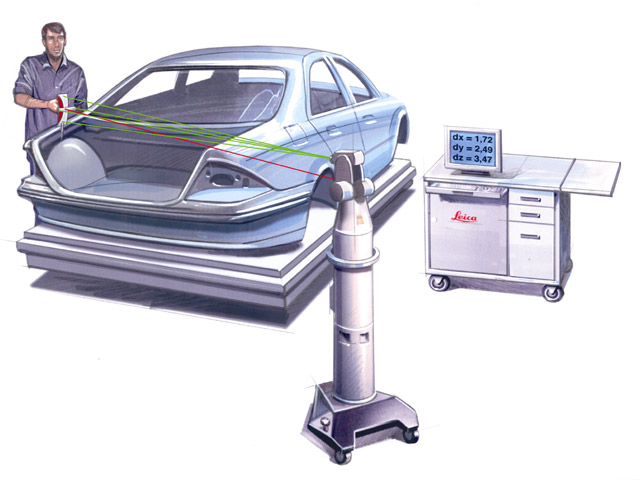 Messprinzip der T-Probe-Messung. Lasertracker ermittelt Distanz zur T-Probe, T-Cam ermittelt Verdrehung, als Ergebnis bekommt man XYZ-Werte der Meßspitze. (Bild v. Hersteller)