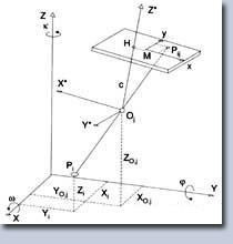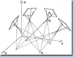 Grundlage dieses Verfahrens ist das Prinzip der Mehr-Bild-Triangulation. Damit läßt sich der Zusammenhang zwischen den Koordinaten der Bildpunkte P(ij), und den gesuchten Koordinaten der Objektpunkte P(i) darstellen. Die photografische Abbildung in einer Kamera läßt sich mathematisch als Zentralprojektion des Objektraumes auf die Bildebene beschreiben. Jeder Objektpunkt P(i) bildet sich dabei in einem Bildpunkt P(ij) ab, welcher der Durchstoßpunkt des Projektionsstrahls mit der Bildebene ist. Der Projektionsstrahl verläuft dabei durch Objektpunkt P(i) und Projektionszentrum O(j). Kehrt man diesen Abbildungsvorgang um, so läßt sich zunächst der Projektionsstrahl, ausgehend von einem Bildpunkt (Pij), über das Projektionszentrum O(j) in den Objektraum verlängert rekonstruieren. Dadurch ist zunächst nur die Richtung bestimmt, auf der sich der gesuchte Objektpunkt P(i) befindet. Die räumliche Lage des Punktes kann bestimmt werden, indem man die Projektionsstrahlen weiterer Bilder hinzuzieht und diese im Objektraum zum Schnitt bringt. Der gesuchte Objektpunkt P(i) liegt im Schnittpunkt der Strahlen.